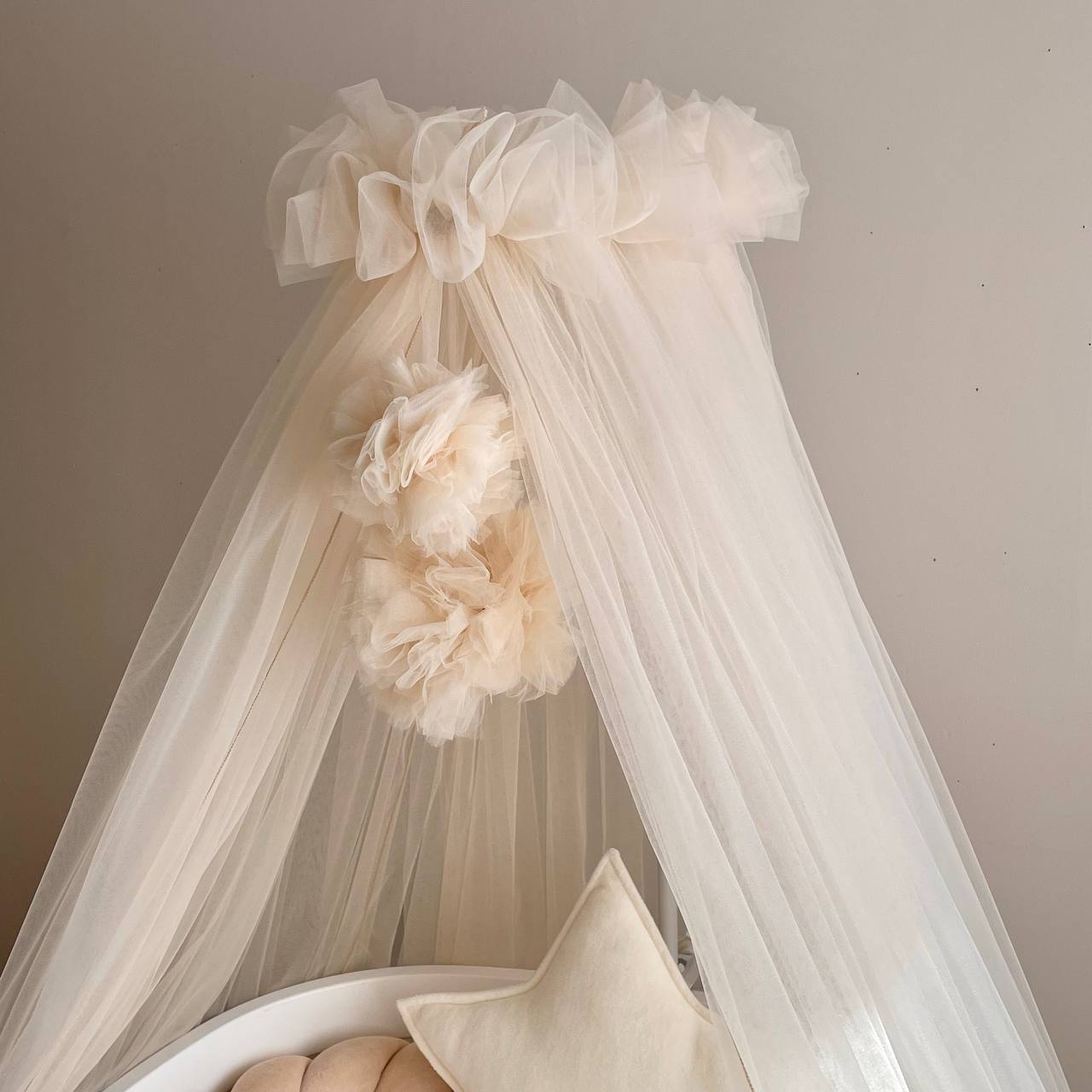 - Deux pompons sont vendu avec le baldaquin. L'accroche (le support) n'est pas fournis.