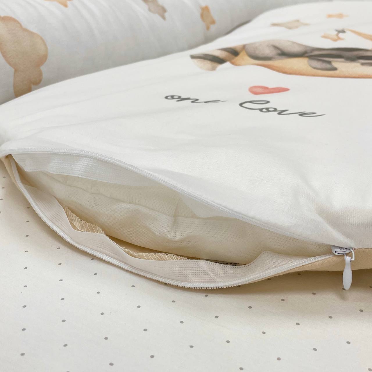 - Entretien : Le lavage du cocoon doit se faire à la main ou en cycle délicat à une température de 30-40 °C. L'utilisation d'un adoucissant est recommandée pour maintenir la douceur du tissu. Il est important d'éviter les détergents contenant des agents de blanchiment ou du chlore, ainsi que le nettoyage à sec. Le cocoon est équipé d'une partie inférieure zippée pour faciliter le lavage et le séchage sans le matelas.