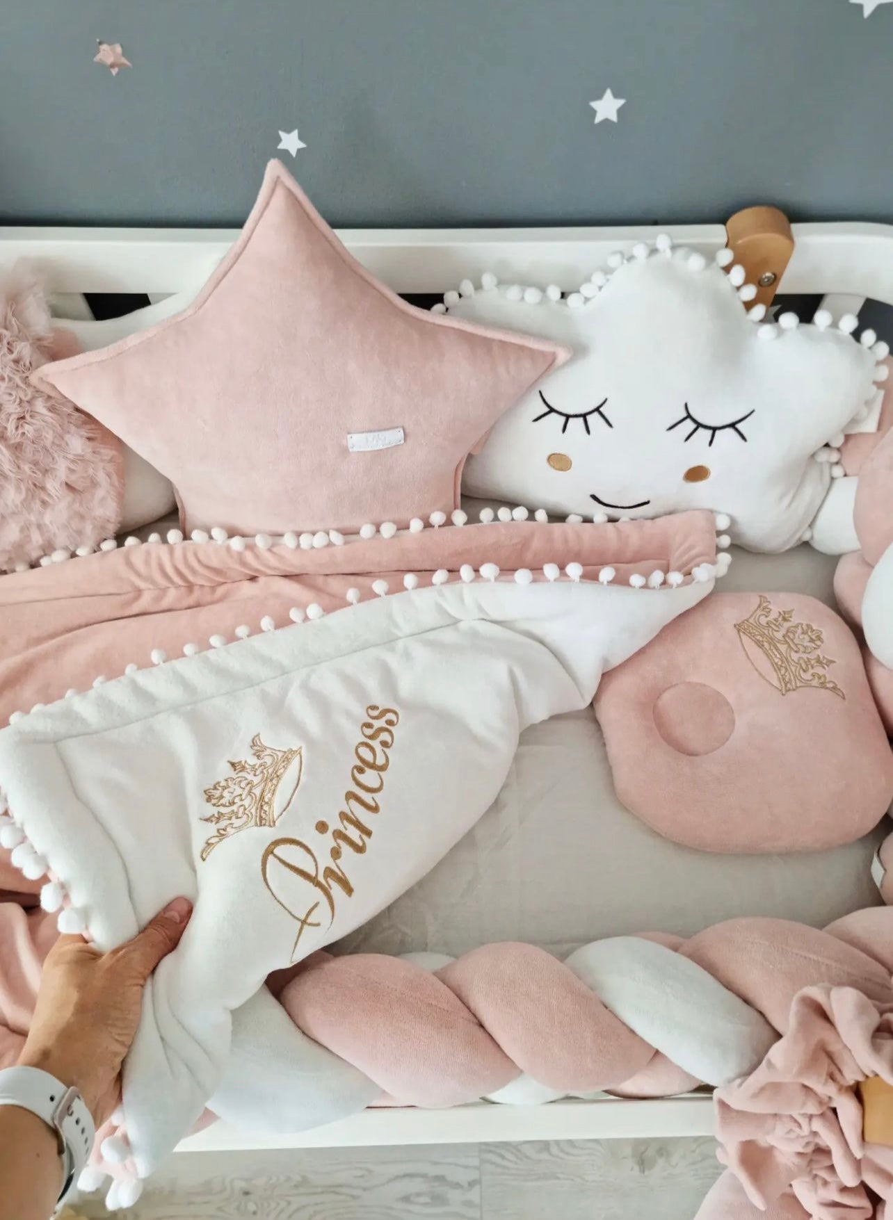 Pour tenir votre petit chouchou bien au chaud ce plaid est en velours de coton et fibre creuse (isolation hivernale), aux extrémité des jolis pompons blancs.